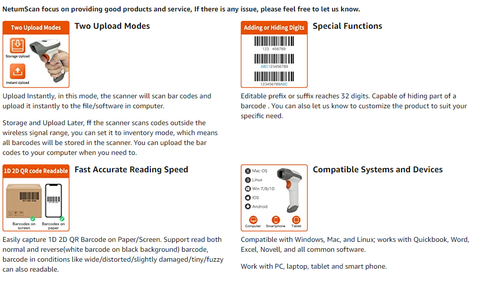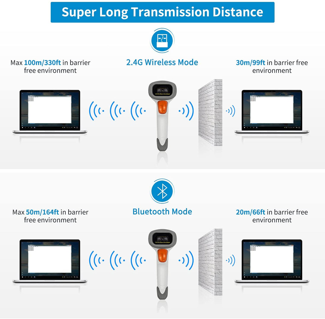 - ➤Auto Scanning & Storage Mode - Manual Scan & Auto-sensing Scan & Continuous Scan. Two working mode: Instant upload mode / storage mode. Scan and store barcodes, then update the data to your device when you come back entering the wireless transmission range. Sometimes the self-sensing scanning function is in the inactive stage, please contact us and be at your service at any time.