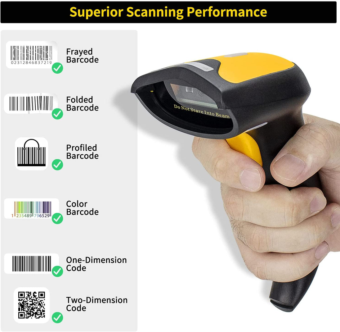 - Professional Anti-Shock Design - Made of great ABS+PC materials,high shock-resistant, and the silicone protective cover can avoid the scratches and friction while falling from the height of 6.57 feet; the technical of IP54 sturdy which protect the wireless barcode scanner from dust and moisture.