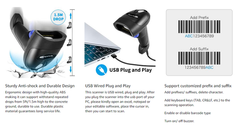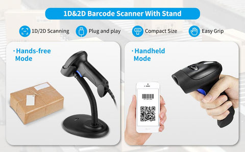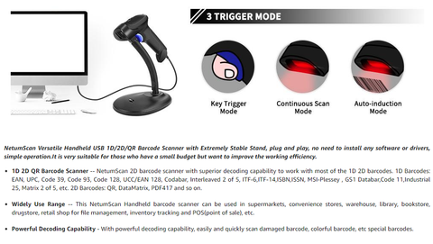 - ✔Three scanning mode - Key trigger mode + Auto-induction mode + Continuous Mode. There is no need to pull the trigger in auto-sensing mode and continuous scanning. Conbined with handsfree stand, free up your hand thoroughly.