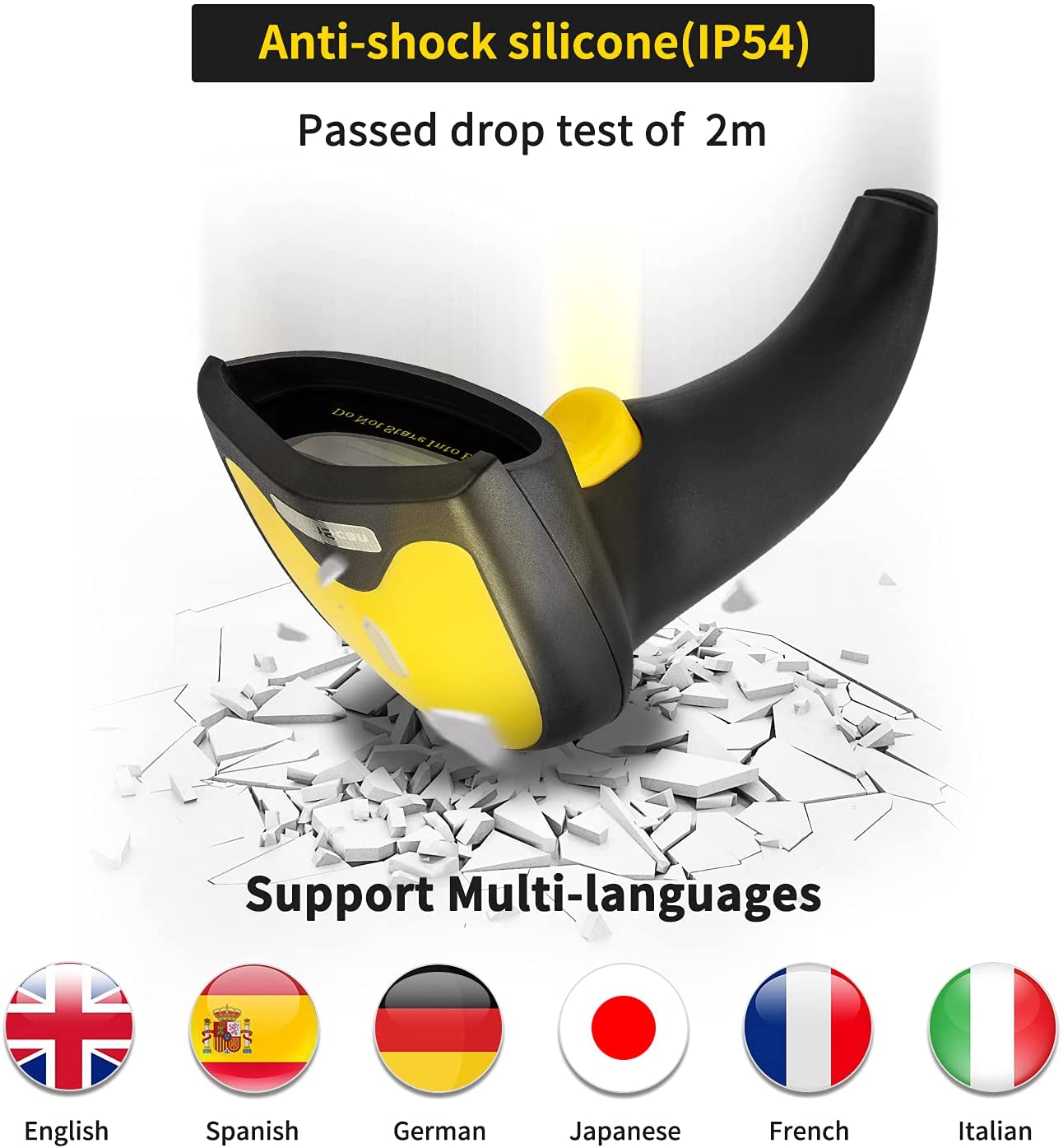 - Professional Anti-Shock Design - Made of great ABS+PC materials,high shock-resistant, and the silicone protective cover can avoid the scratches and friction while falling from the height of 6.57 feet; the technical of IP54 sturdy which protect the wireless barcode scanner from dust and moisture.