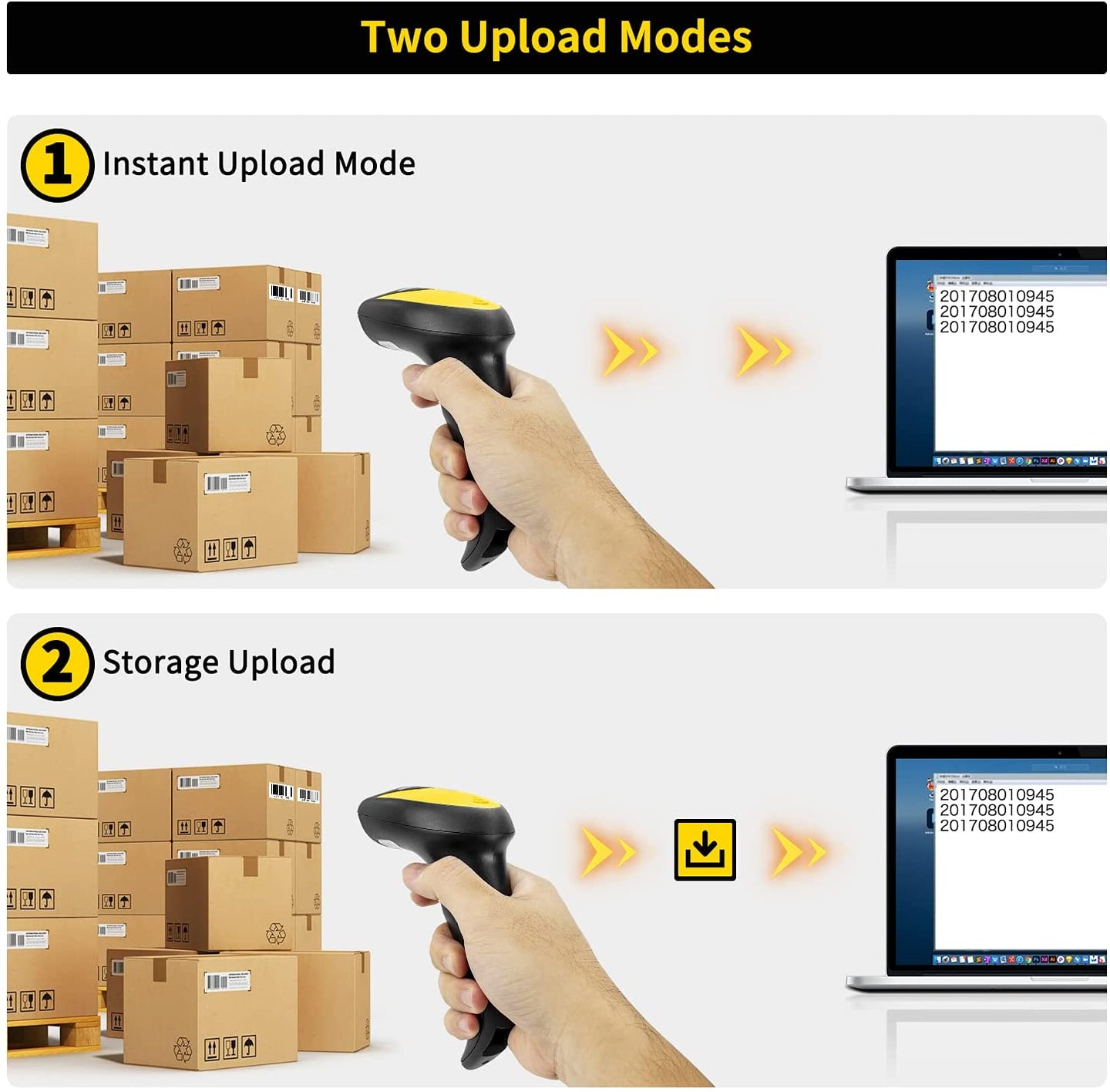 - Auto Scanning & Storage Mode - Manual Scan & Auto-sensing Scan & Continuous Scan. Two working mode: Instant upload mode / storage mode. Scan and store barcodes, then update the data to your device when you come back entering the wireless transmission range. Sometimes the self-sensing scanning function is in the inactive stage, please contact us and be at your service at any time.